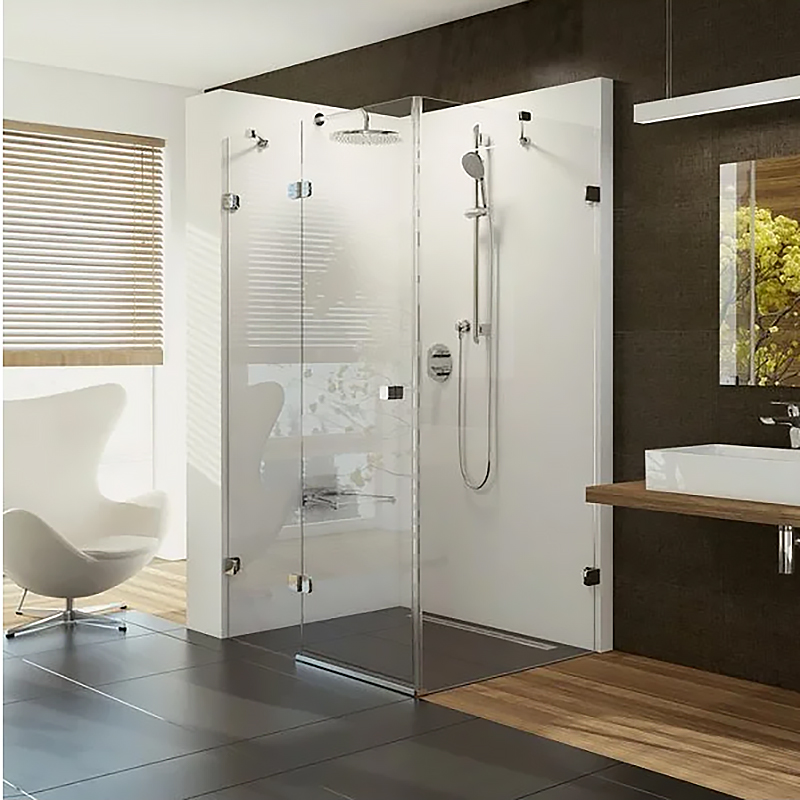 Петли не имеют выступающих частей изнутри душевого угла, что облегчает его обслуживание. Подъемный механизм петель обеспечивает автоматический подъём и опускание двери при открытии и закрытии. Чистый металл и массивное исполнение эргономичной ручки подчеркивают величественное впечатление от всего душевого уголка. Один длинный и один короткий держатели стекла обеспечивают максимальную стабильность изделия.