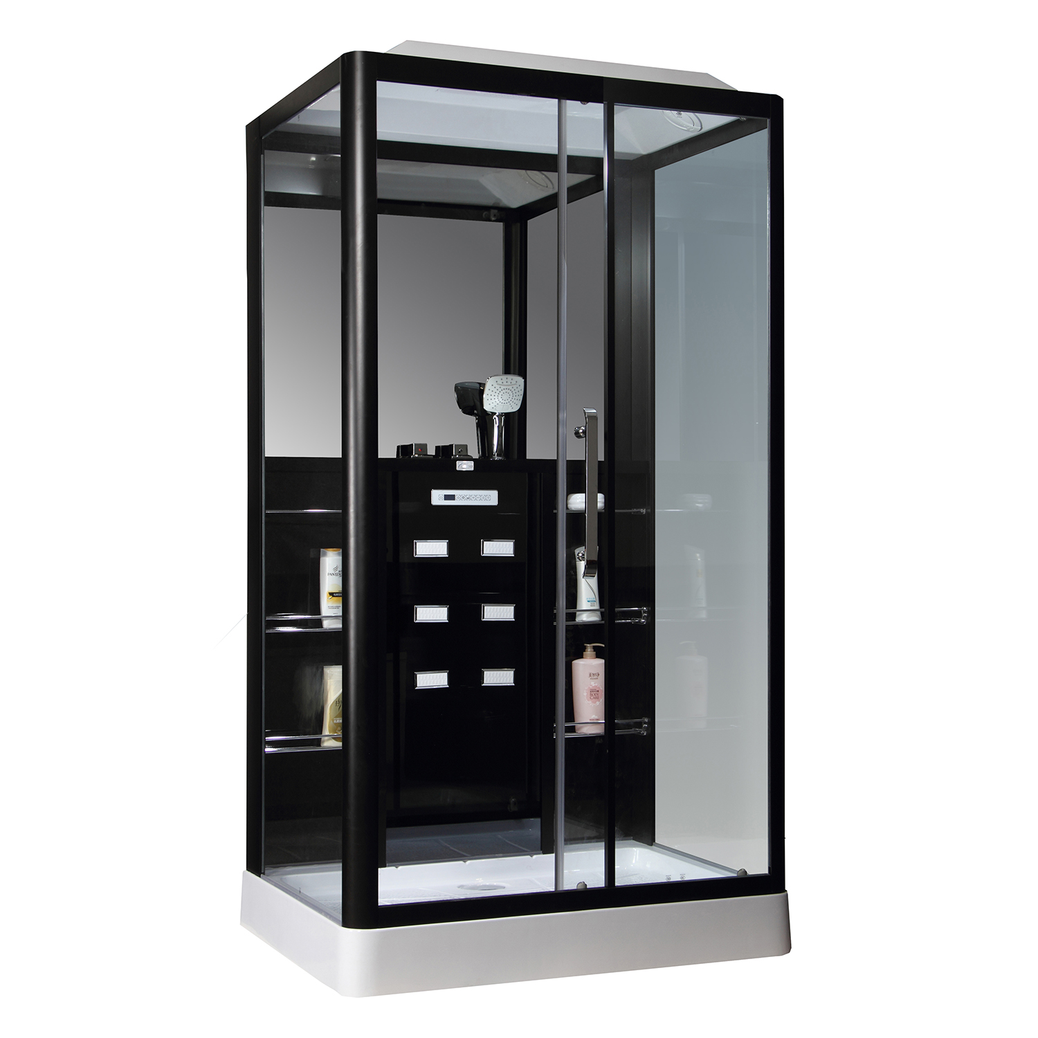 Алюминиевая рама, Закаленное стекло 6мм, управляется сенсорной панелью, радио, вентилятор, светильник, полка, смеситель 3 режимный кран, массаж ног, крыша с верхним душем, ручная лейка.