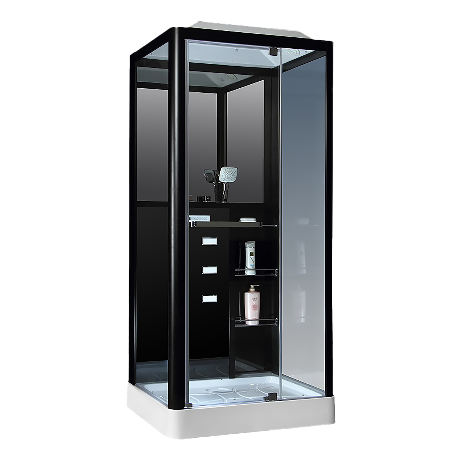 Алюминиевая рама, Закаленное стекло 6мм, управляется сенсорной панелью, радио, вентилятор, светильник, полка, смеситель 3 режимный кран, массаж ног, крыша с верхним душем, ручная лейка.