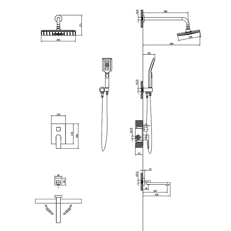 верхний душ#держатель для душевой лейки#душевая лейка#душевой шланг#излив#панель смесителя#скрытая монтажная часть#смеситель#шланговое подключение