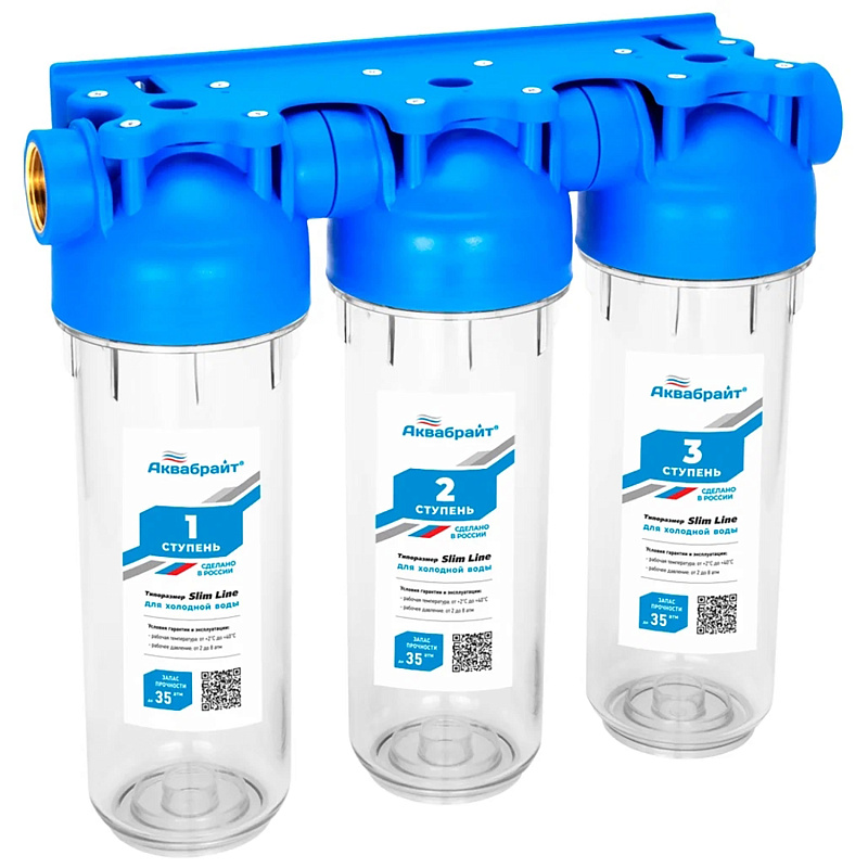 АБФ-3 1/2, Трехступенчатый магистральный фильтр АКВАБРАЙТ стандарт SLIM LINE. Прозрачные корпуса. Рабочее давление от 2 до 6 атм. Подключение ЛАТУННАЯ ВСТАВКА 1/2 дюйма. Кронштейн и ключ в комплекте.