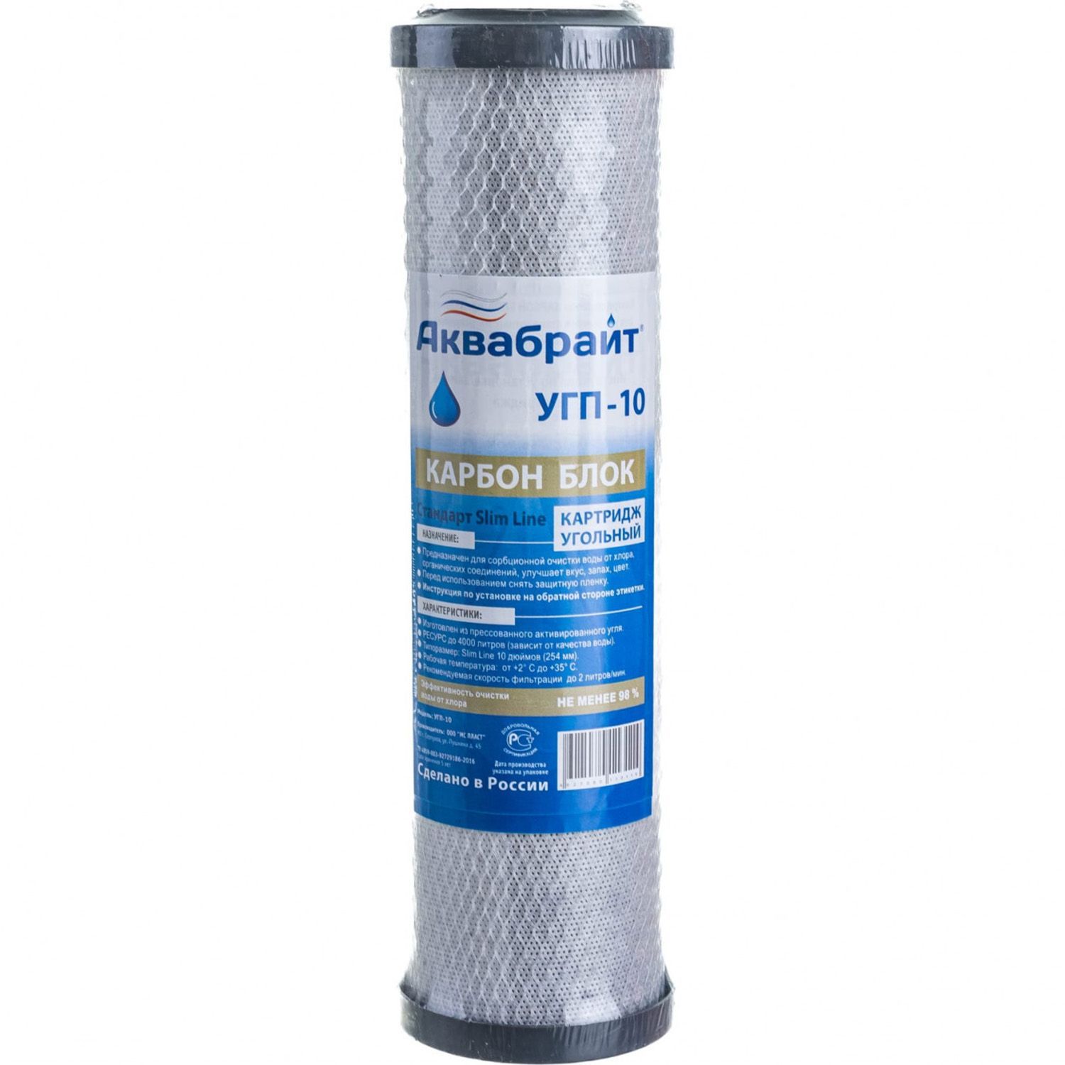 Картридж АКВАБРАЙТ УГП-10 изготовлен из спеченного прессованного активированного угля с пищевым допуском. Картридж предназначен для сорбционной очистки воды от хлора, органических соединений. Улучшает органолептические показатели воды (вкус, запах, цвет).