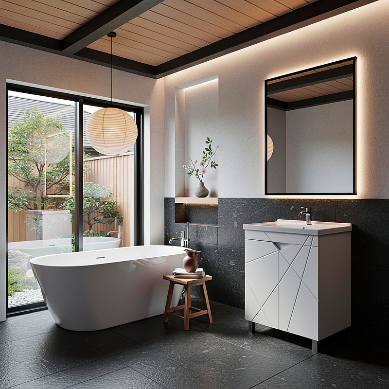 Модели одного комплекта (набора) мебели Оптимум выполнены в едином архитектурно-художественном и конструктивно-технологическом решении. Фасады имеют геометрическую фрезеровку с встроенной ручкой. Классический конструктив тумб под раковину с двумя дверцами и полкой позволяет удобно разместить бытовую химию, косметические средства и все необходимое.