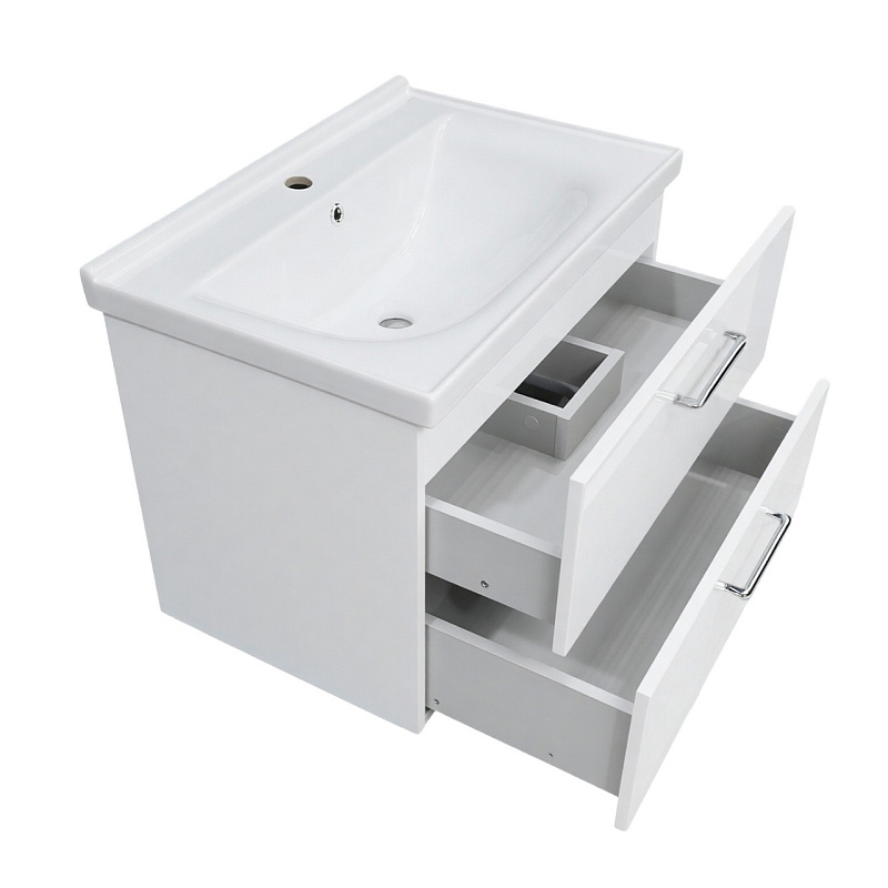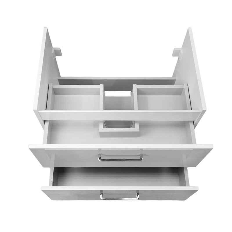 Два выдвижных ящика: Просторные ящики с механизмом доводчика обеспечивают плавное и бесшумное закрывание, предотвращая удары и продлевая срок службы мебели. Это идеальное место для хранения полотенец, косметики, бытовой химии и других необходимых мелочей, поддерживая порядок в ванной комнате.