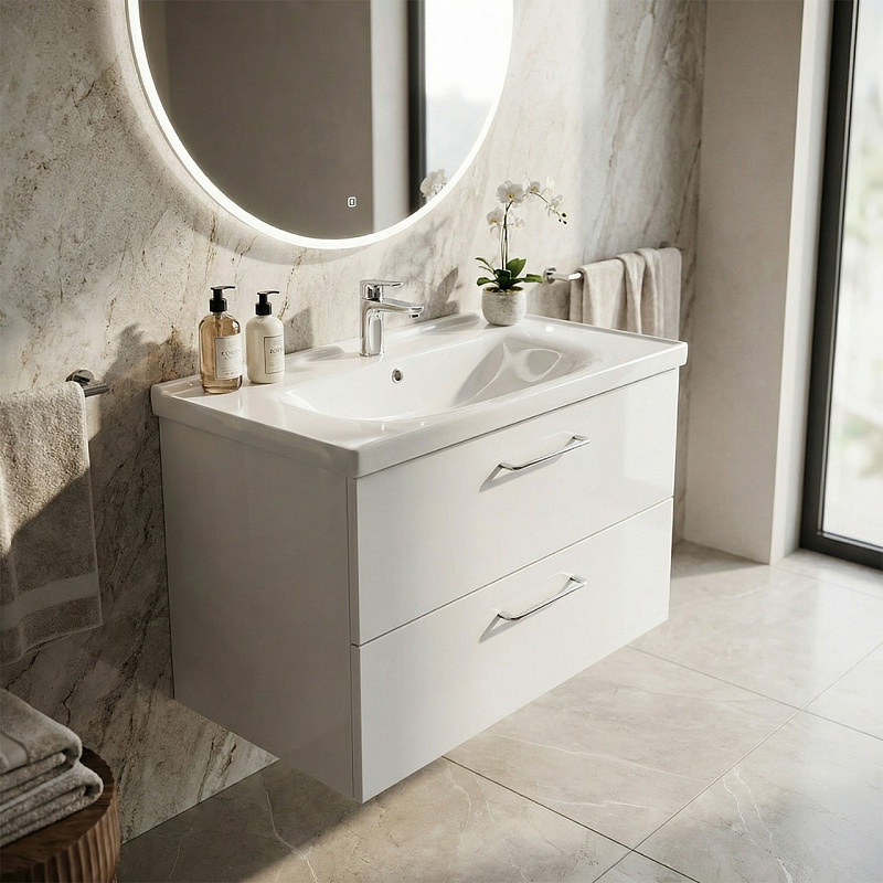 Высокое качество материалов: Использование МДФ, глянцевой эмали и санфаянса гарантирует долговечность и устойчивость к воздействию влаги и перепадам температур.