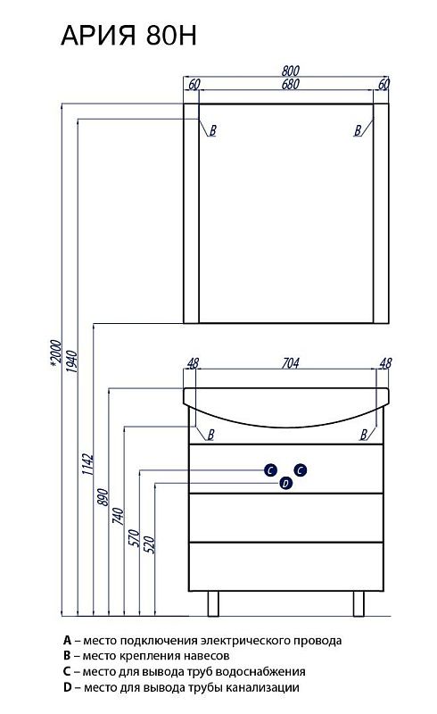 Напольная тумба устанавливается при помощи регулируемых по высоте ножек. В тумбе – три выдвижных ящика из влагостойкой ДСП в отделке «молочный дуб», верхний снабжен системой организации пространства. Ящики установлены на направляющие полного выдвижения немецкого производителя Blum, благодаря чему ими удобно пользоваться даже с керамической раковиной, выступающей вперед.
