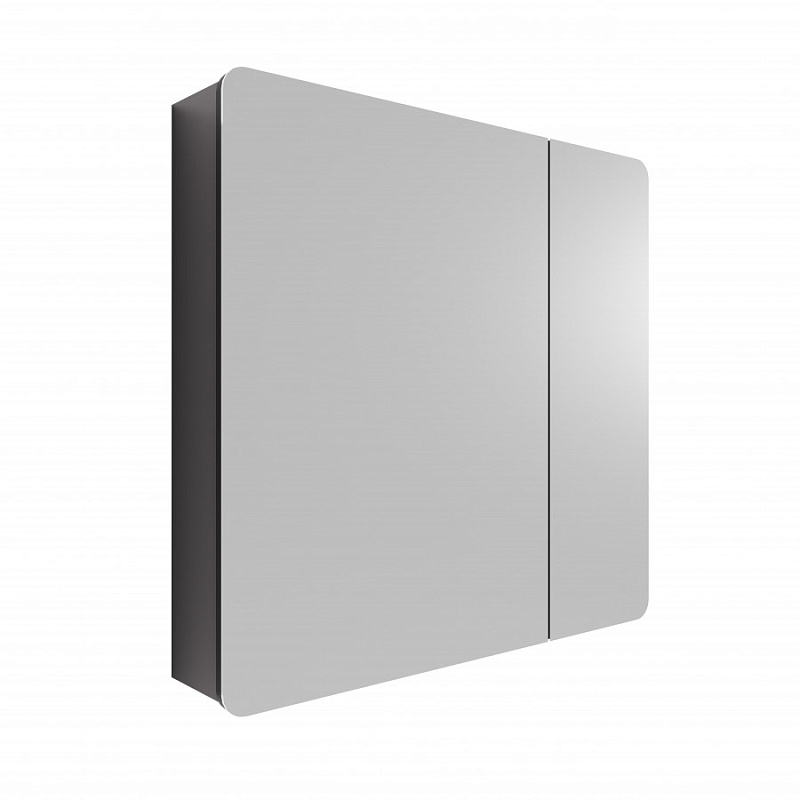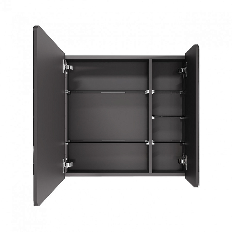 Зеркальный шкаф выполнен из влагостойкой ЛДСП: корпус выполнен из ЛВДСП в цвете кашемир, а фасад из ЛВДСП, покрытый зеркальным полотном. Фасад зеркального шкафа имеет закругленные углы, что повторяет стилистику Ар-деко и мягкие плавные закругления на раковине. Внутреннее пространство разделено на две половины, в каждой из которой есть регулируемые полочки из затемненного стекла для хранения. Эти полочки также установлены на специальных держателях, что предотвращает опрокидывание предметов. Открывание за фасад позволяет быстро добраться до необходимых вещей, а благодаря петлям с доводчиками обеспечивается плавное закрывание, что гарантирует бесшумность и комфорт использования мебели.