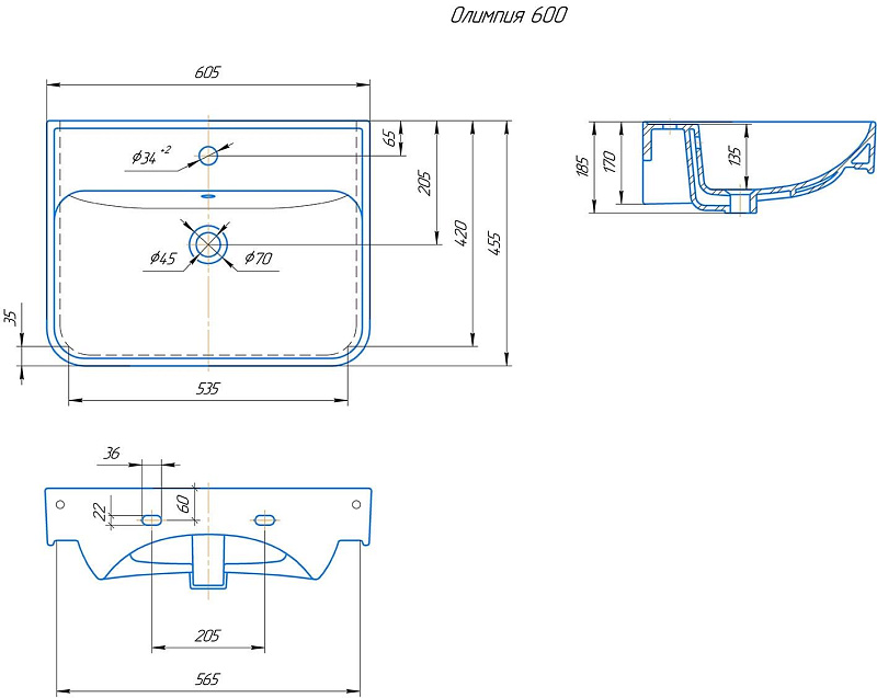 Безупречно эстетичная прямоугольная форма раковины Kirovit ОЛИМПИЯ 60 с закругленными краями и объемной чашей создана для непревзойденного удобства использования.
