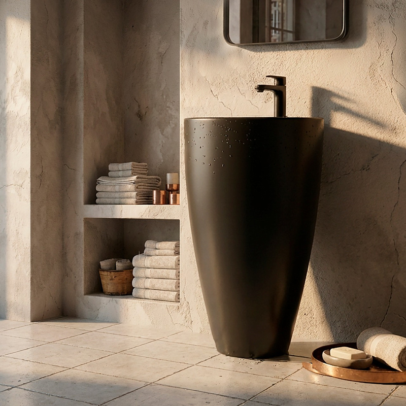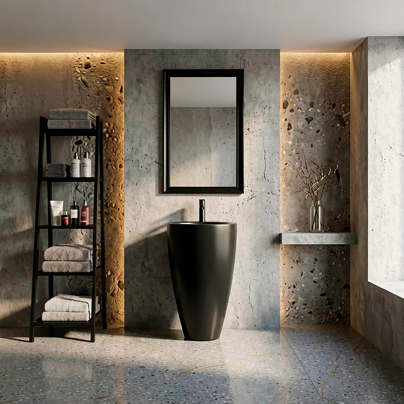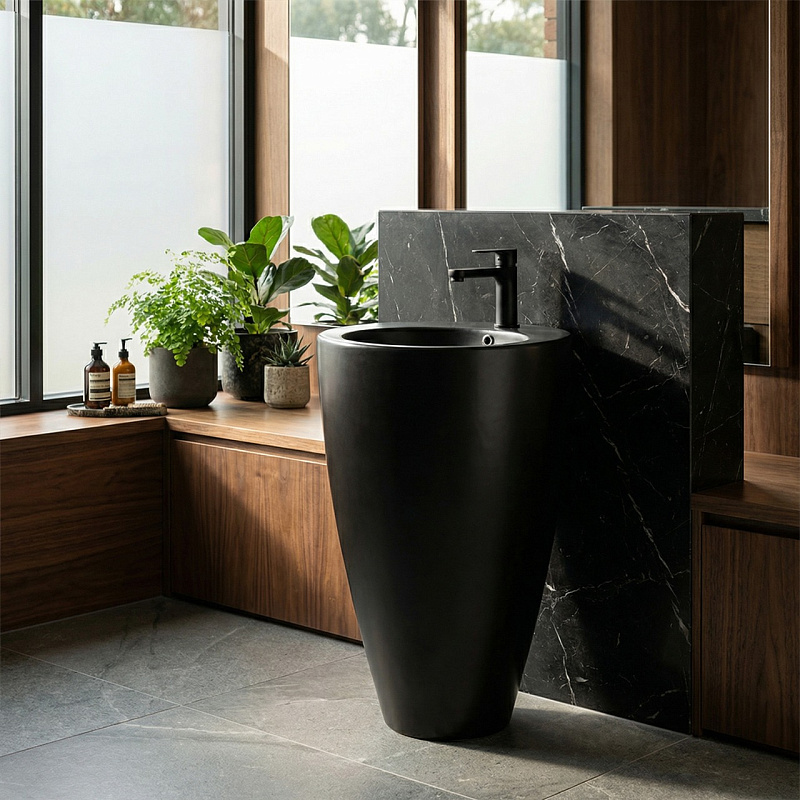 Раковина напольная Azario COMELLA 490х490х840 — стильное и функциональное решение для ванной комнаты. Изготовлена из высококачественного санфаянса с черным матовым покрытием, что придаёт изделию современный и элегантный вид. Отдельностоящая круглая конструкция размером 490х490 мм и высотой 840 мм обеспечивает удобство использования и гармонично вписывается в интерьер любого стиля. Раковина устойчива к механическим повреждениям и легко очищается, что делает её практичным выбором для дома или общественных помещений. Идеальный вариант для тех, кто ценит качество, дизайн и комфорт.
