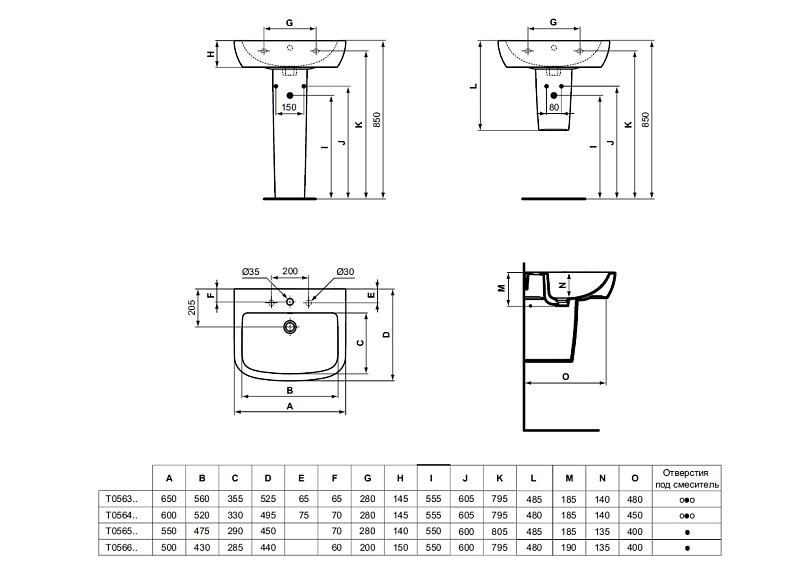 TEMPO Умывальник 60X50 см, 1 отверстие под смеситель, с отверстием перелива, для монтажа с колонной T422901 или полуколонной T423001, без крепежа (рекомендуемый крепеж - WW965340)