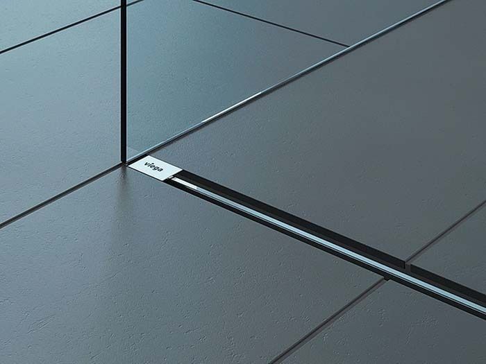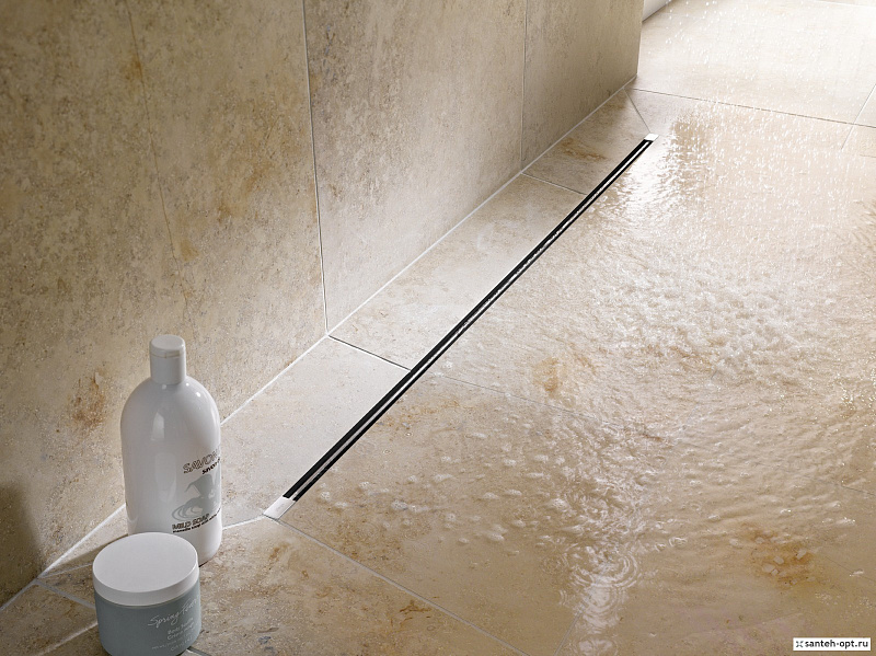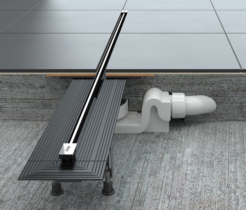 монтажные опоры, торцевые заглушки, сифон с функцией самоочищения, регулируемое по высоте крепление для дизайн-вставки, компенсатор высоты, фланец для нанесения/закрепления гидроизоляции, набор уплотнений, шаблон для укорачивания