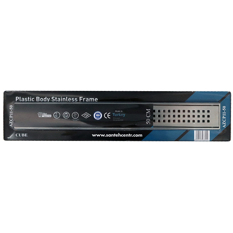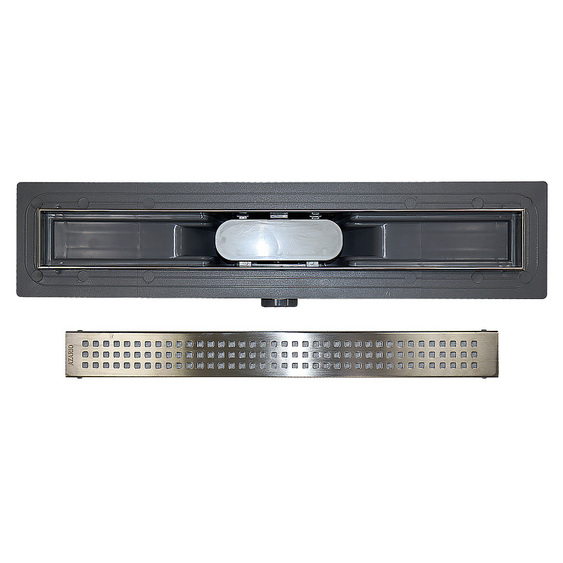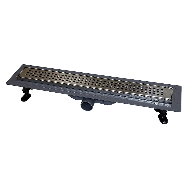 В комплекте - самоклеящаяся гидроизоляционная фолия, регулируемые опоры (ножки), комплект крепления (нейлоновые дюбеля и шурупы), решетка из нержавеющей стали, пластиковый ключ для поднятия нержавеющей решетки и монтажная инструкция по установке.