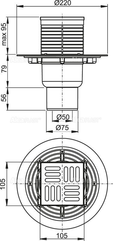 СЛИВНОЙ ТРАП 105×105/50/75 ММ ПРЯМОЙ СТОК, РЕШЕТКА ИЗ НЕРЖАВЕЮЩЕЙ СТАЛИ, ГИДРОЗАТВОР – МОКРЫЙ