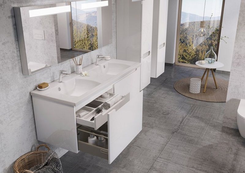 Простой уход осуществляется благодаря форме изделий, материалом отделки и подвесным тумбам.