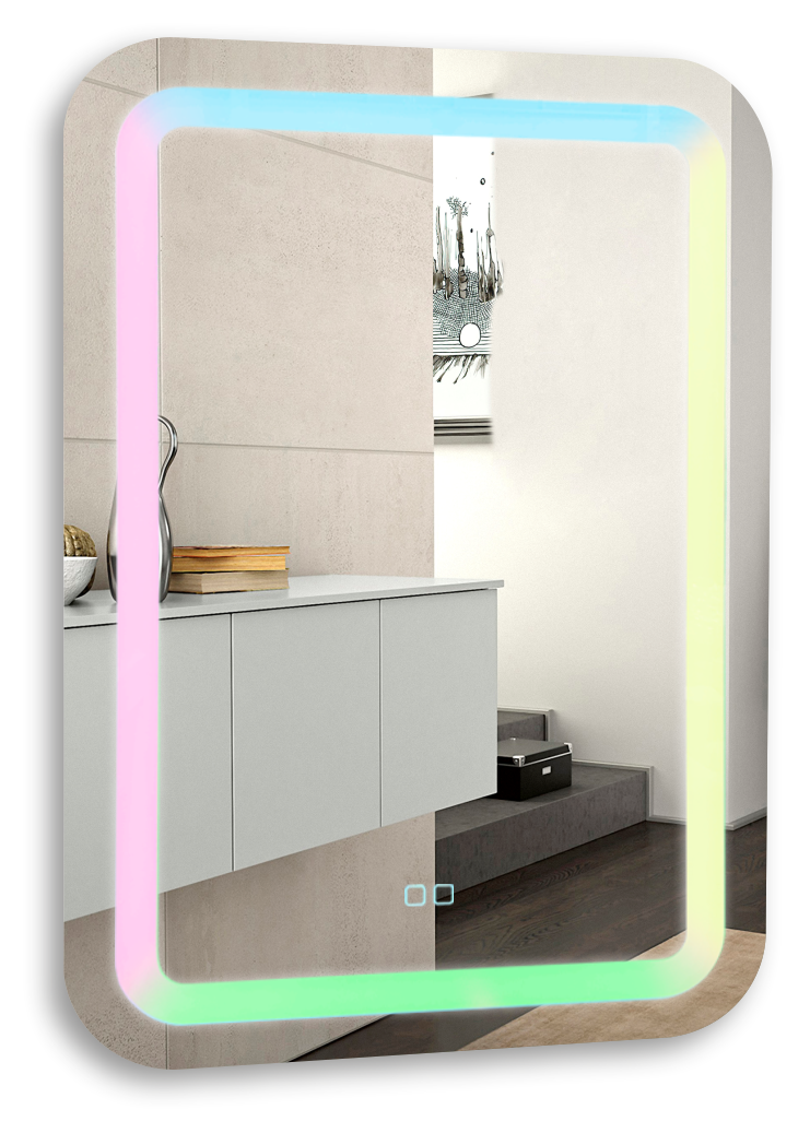 Зеркало с LED-подсветкой и выбором мультицветов. Модель сделана из стекла высшего качества M0 (влагостойкое, минимальные оптические искажения). LED-подсветка выдерживает до 50 тыс. часов работы в непрерывном режиме. Изделие оснащено 2 кнопками. Первая - сенсорный выключатель с функцией плавного диммирования, с запоминанием последнего значения. Короткие касания светящейся области включают/выключают подсветку, длительное касание меняет яркость свечения.  Вторая- выбор цвета свечения и их оттенков. Экологически чистый продукт выполненный по стандартам ЕС.
